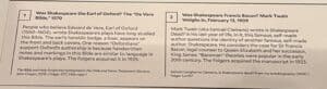 In a display case at the Folger, under a wall plaque discussing white supremacy in Shakespearean culture and next to a letter from Mark Twain considering Francis Bacon as the author, is the bible of Edward de Vere, the 17th Earl of Oxford. The exhibition card reads in part, “One reason ‘Oxfordians’support Oxford’s authorship is because handwritten notes and markings in this Bible are similar to language in Shakespeare’s plays.”